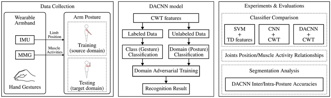 In hand gesture recognition, classifying gestures across multiple arm postures is challenging due to the dynamic nature of muscle fibers and the need to capture muscle activity through electrical connections with the skin. This paper presents a gesture recognition architecture addressing the arm posture challenges using an unsupervised domain adaptation technique and a wearable mechanomyogram (MMG) device that does not require electrical contact with the skin. To deal with the transient characteristics of muscle activities caused by changing arm posture, Continuous Wavelet Transform (CWT) combined with Domain-Adversarial Convolutional Neural Networks (DACNN) were used to extract MMG features and classify hand gestures. DACNN was compared with supervised trained classifiers and shown to achieve consistent improvement in classification accuracies over multiple arm postures. With less than 5 minutes of setup time to record 20 examples per gesture in each arm posture, the developed method achieved an average prediction accuracy of 87.43%64.29%200ms600ms92.32%71.75%